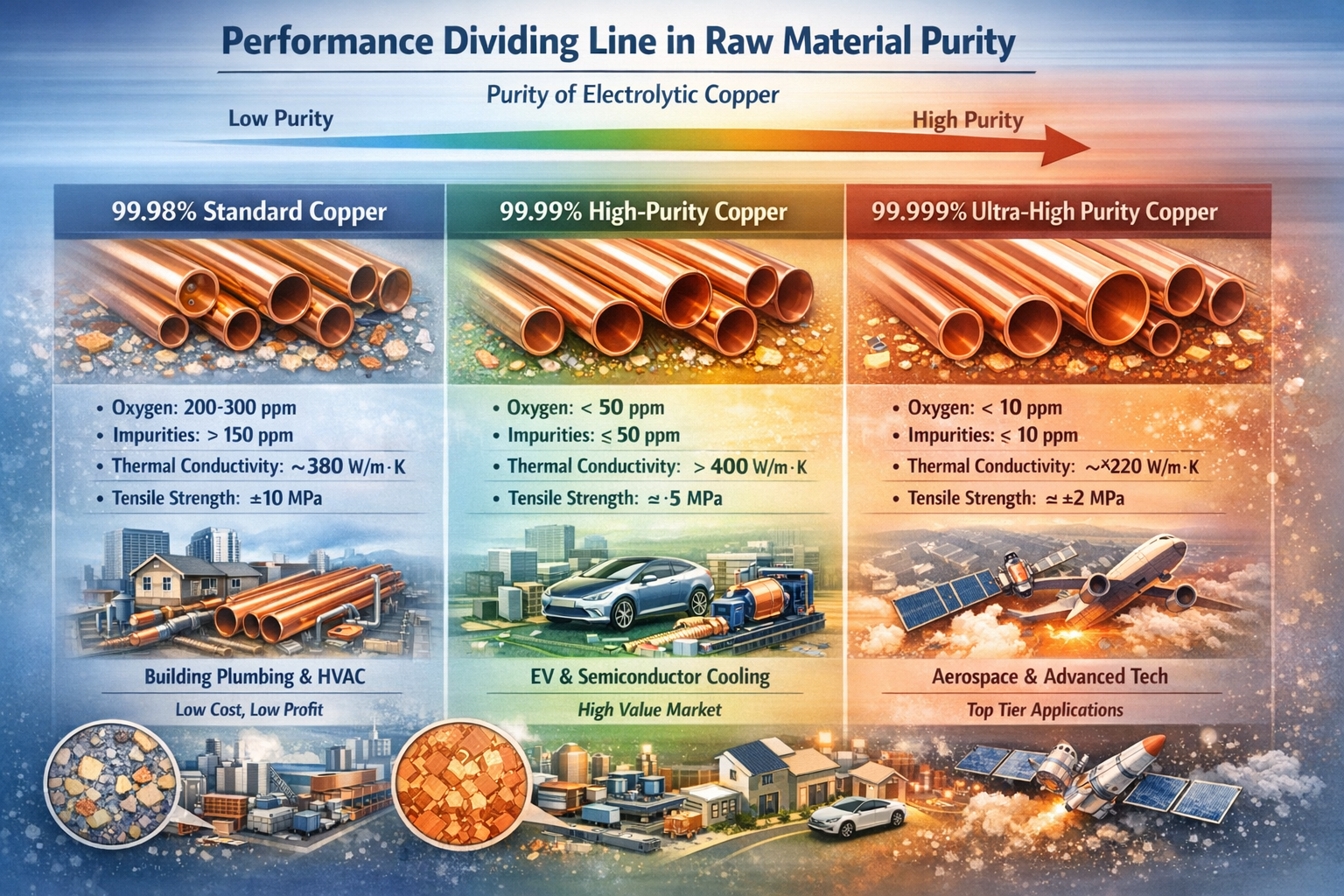 Tabel 1: Vergelijking van kernparameters en toepassingswaarde van grondstoffen voor koperen buizen met verschillende zuiverheidsniveaus