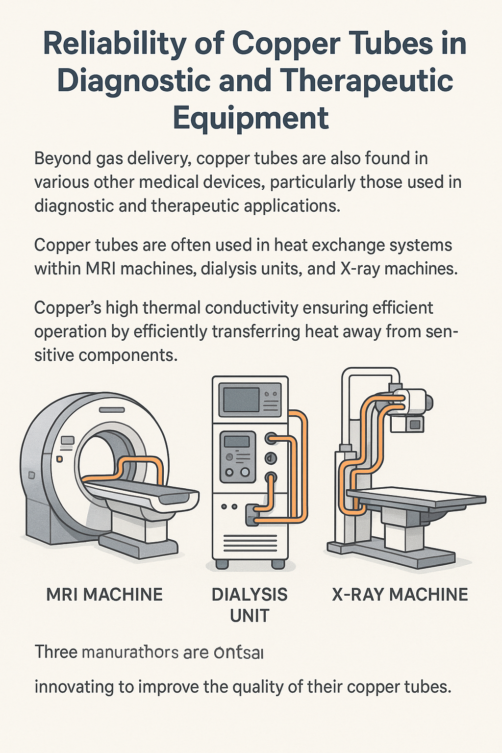 Naast de gastoevoer worden koperen buizen ook aangetroffen in diverse andere medische apparaten, vooral die welke worden gebruikt in medische apparatuur diagnostische en therapeutische toepassingen . Er worden bijvoorbeeld vaak koperen buizen gebruikt warmtewisselingssystemen binnen medische apparatuur zoals MRI-machines, dialyse-eenheden en röntgenapparatuur. De hoge thermische geleidbaarheid van koper zorgt ervoor dat deze machines efficiënt en veilig werken door de warmte efficiënt af te voeren van gevoelige componenten.