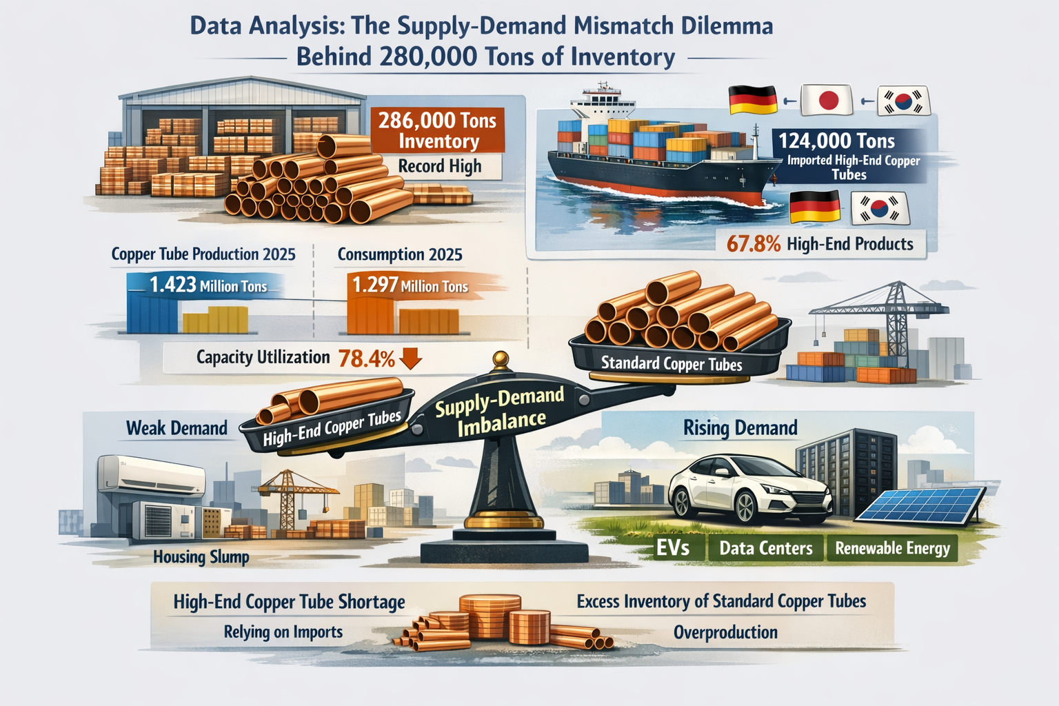 De meest recente gegevens van het Nationale Bureau voor de Statistiek en de China Nonferrous Metals Industry Association schetsen een beeld van de onevenwichtigheid in de Chinese koperen buizenindustrie. In 2025 bereikte de nationale productie van koperen buizen 1,423 miljoen ton, een stijging op jaarbasis van 6,8%, maar het schijnbare verbruik in dezelfde periode bedroeg slechts 1,297 miljoen ton, en de bezettingsgraad daalde tot 78,4%, een daling van 4,2 procentpunten vergeleken met 2024. Eind maart 2025 bereikte de voorraad koperen buizen van grote koperverwerkende bedrijven in China 286.000 ton, een nieuw hoogtepunt in bijna vijf jaar, waarbij de voorraad in Oost-China maar liefst 52,3% bedraagt, wat de bijzonder prominente regionale vraag- en aanbodmismatch .
