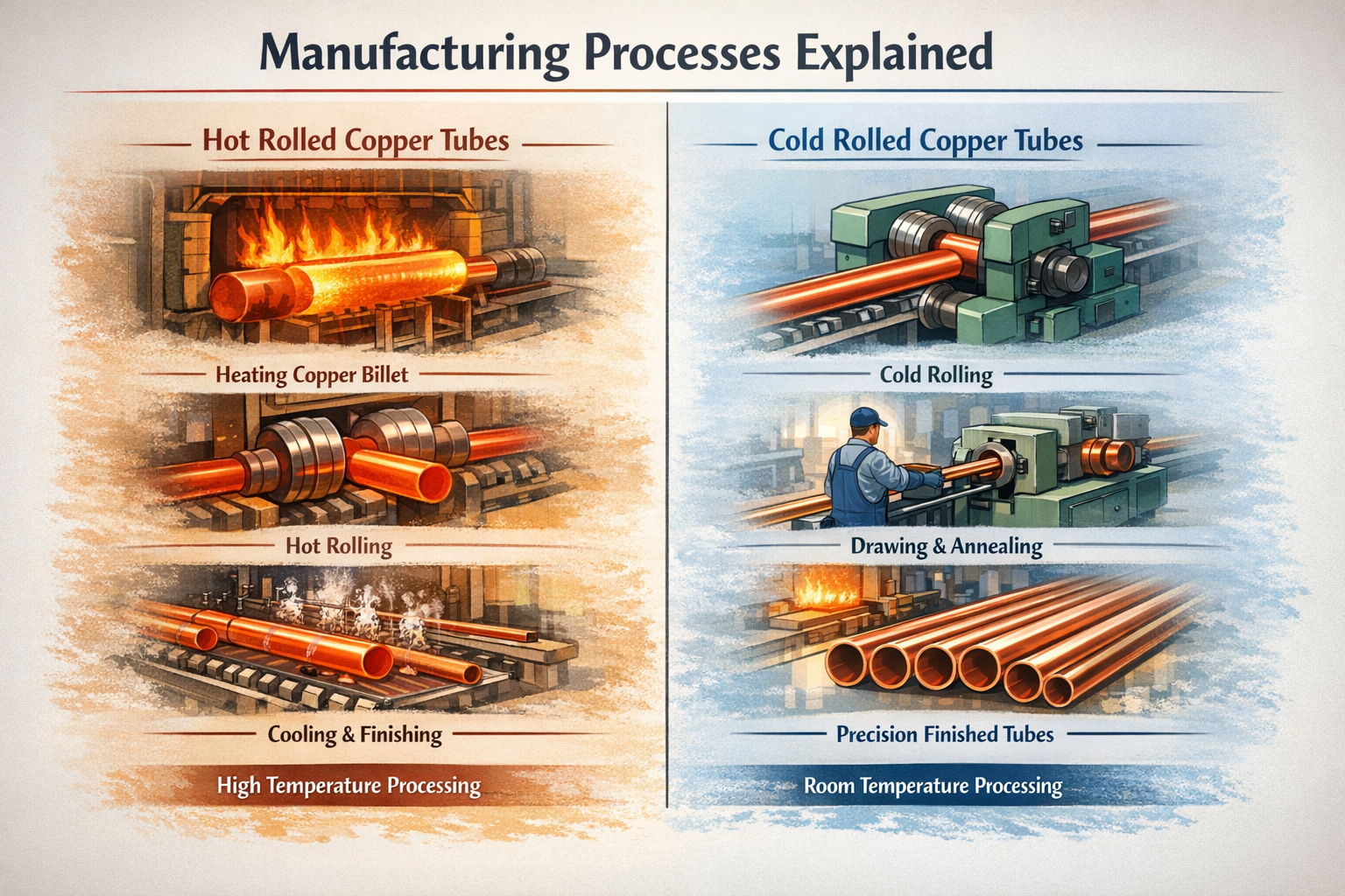 Warmgewalste koperen buizen worden geproduceerd door koperen knuppels boven de herkristallisatietemperatuur te verwarmen en ze in buisvormige vormen te walsen. Bij hogere temperaturen wordt koper beter verwerkbaar, waardoor een efficiënte vormgeving en een hoge output mogelijk zijn. Na het walsen worden de buizen afgekoeld en kunnen ze basisafwerkingen ondergaan.