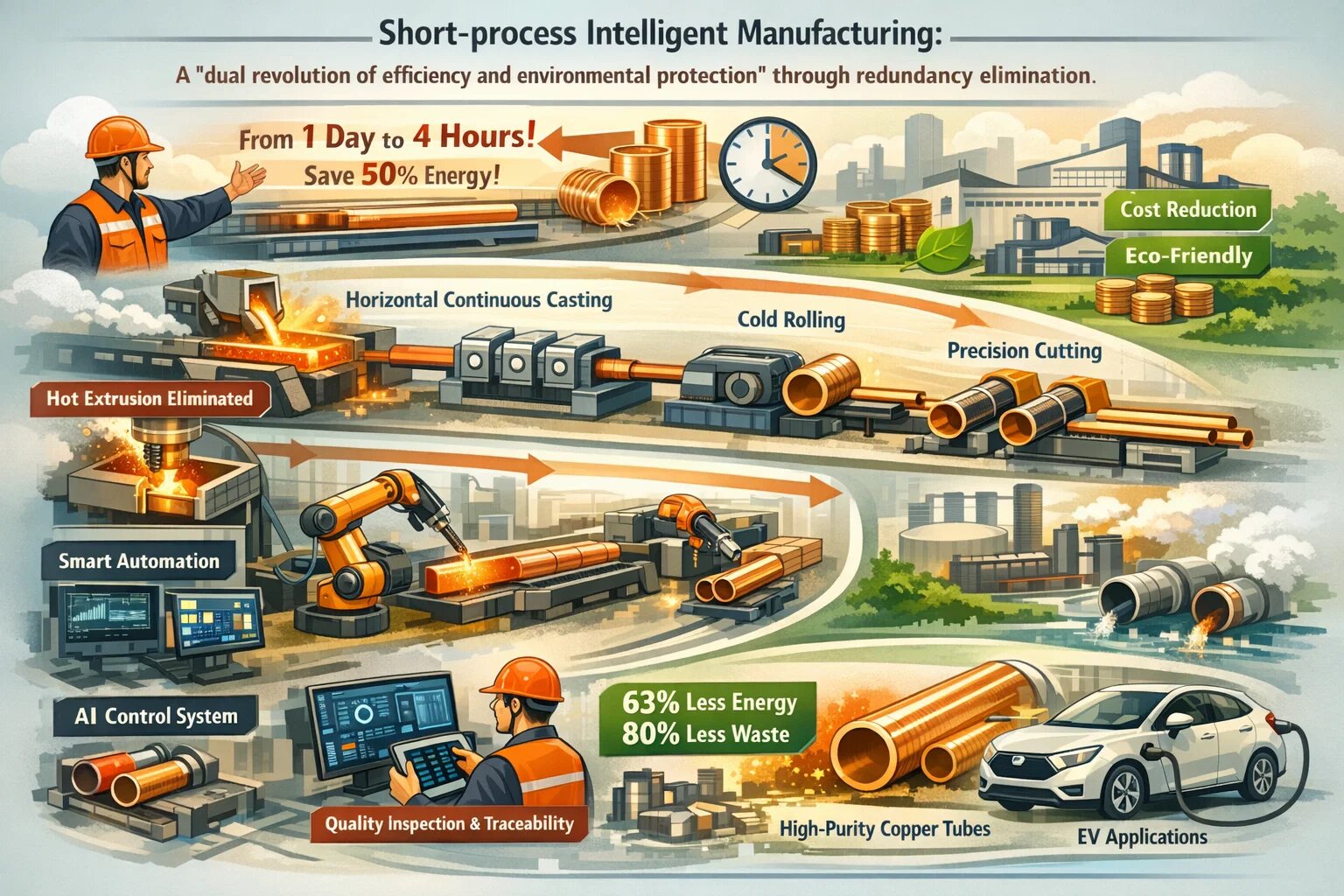 De belangrijkste doorbraken liggen in ‘procesvereenvoudiging’ en ‘intelligente empowerment’. De traditionele "hete extrusie"-stap wordt direct geëlimineerd en ultrasoongeassisteerde giettechnologie wordt gebruikt om de kristalstructuur van de onbewerkte buis te optimaliseren, waardoor de metaalsegregatie wordt verminderd en een binnenoppervlakruwheid van ≤0,8 μm ontstaat, waardoor deze direct kan doorgaan naar het koude walsproces zonder daaropvolgend polijsten. In de "hot-state three-furnace" korte-procesproductielijn van Southwest Copper bereikt de geïntegreerde configuratie van "met zuurstof verrijkte zijgeblazen smelting, multi-lance topgeblazen continue raffinage, roterende anodeovenraffinage" een continue productie van koperconcentraat tot anodekoper, met een jaarlijkse verwerkingscapaciteit van 1,6 miljoen ton. Dit vermindert drie overdrachtsstappen in vergelijking met traditionele processen en verkleint de voetafdruk van de apparatuur met 40%.
