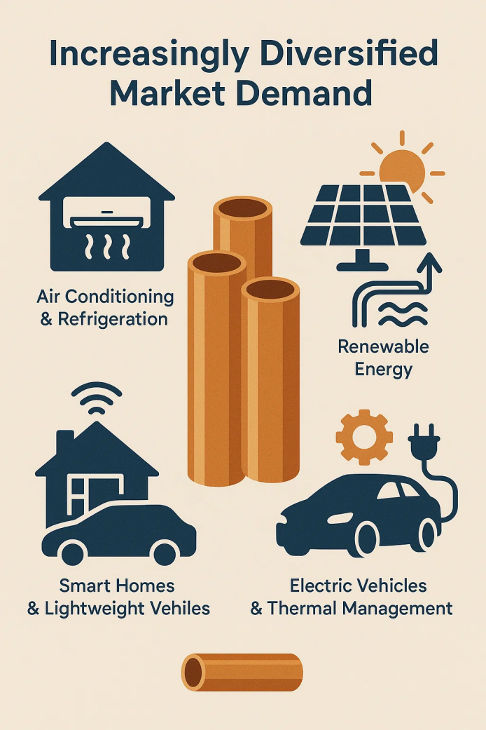 De marktvraag in de koperen buisindustrie ondergaat ook belangrijke veranderingen. Met de wereldwijde klimaatverandering en het stijgende milieubewustzijn neemt de vraag naar koperen buizen in de sectoren airconditioning, koeling en hernieuwbare energie toe. In het bijzonder zijn in de nieuwe energiesector koperen buizen vanwege hun uitstekende thermische geleidbaarheid en corrosieweerstand een belangrijk materiaal geworden in energieapparaten zoals zonne- en geothermische energie.