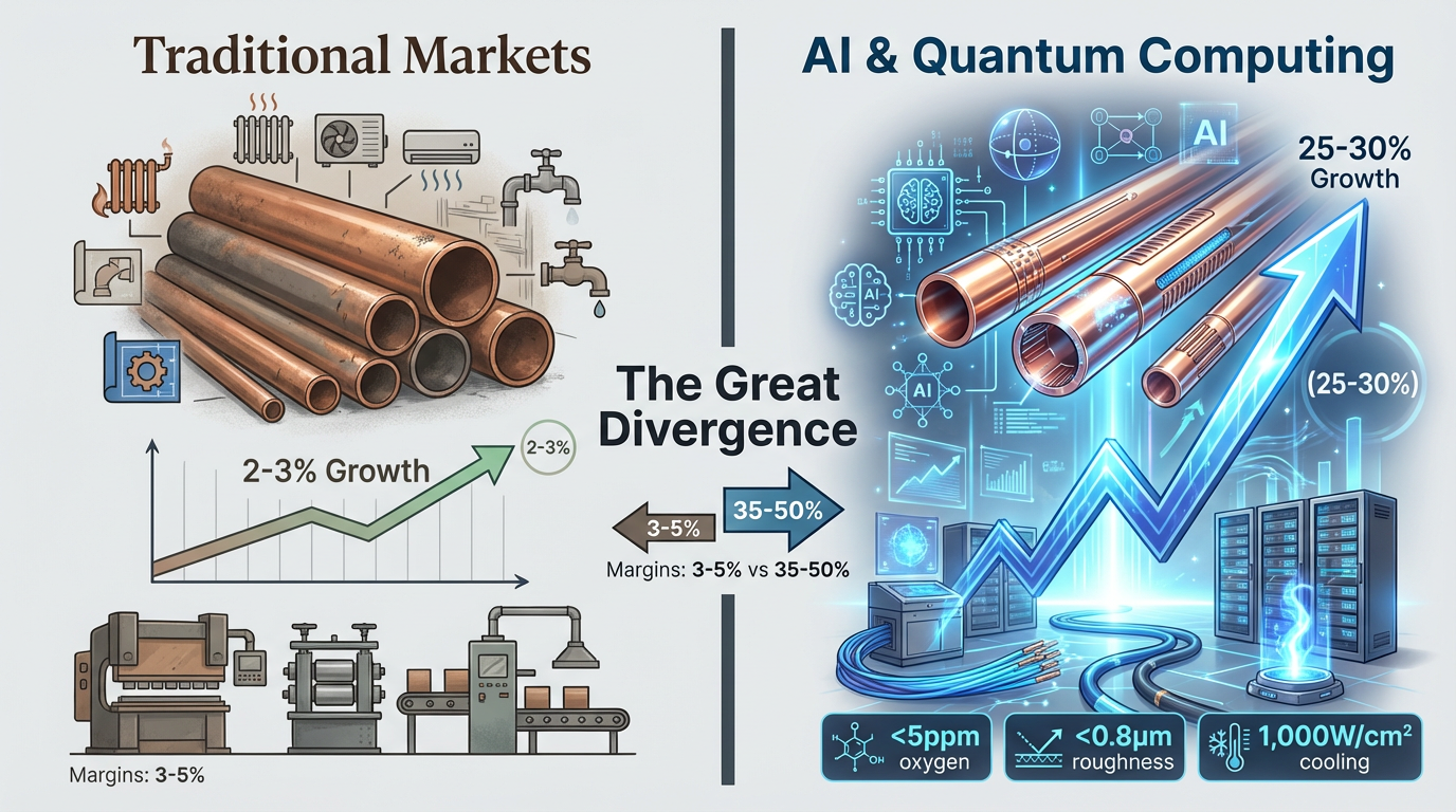 De mondiale koperen buis De sector ervaart een ongekende fragmentatie. Terwijl traditionele constructie and HVAC-toepassingen groeit met een bescheiden 2-3% per jaar, de vraag naar precisie buizen in de productie van halfgeleiders, de AI-infrastructuur en kwantumcomputing stijgt jaarlijks met 25-30%. Deze divergentie creëert een markt met twee niveaus: bulkproducenten worstelen met marges van 3-5%, terwijl gespecialiseerde fabrikanten brutomarges van 35-50% hanteren voor buizen die aan extreme specificaties voldoen.