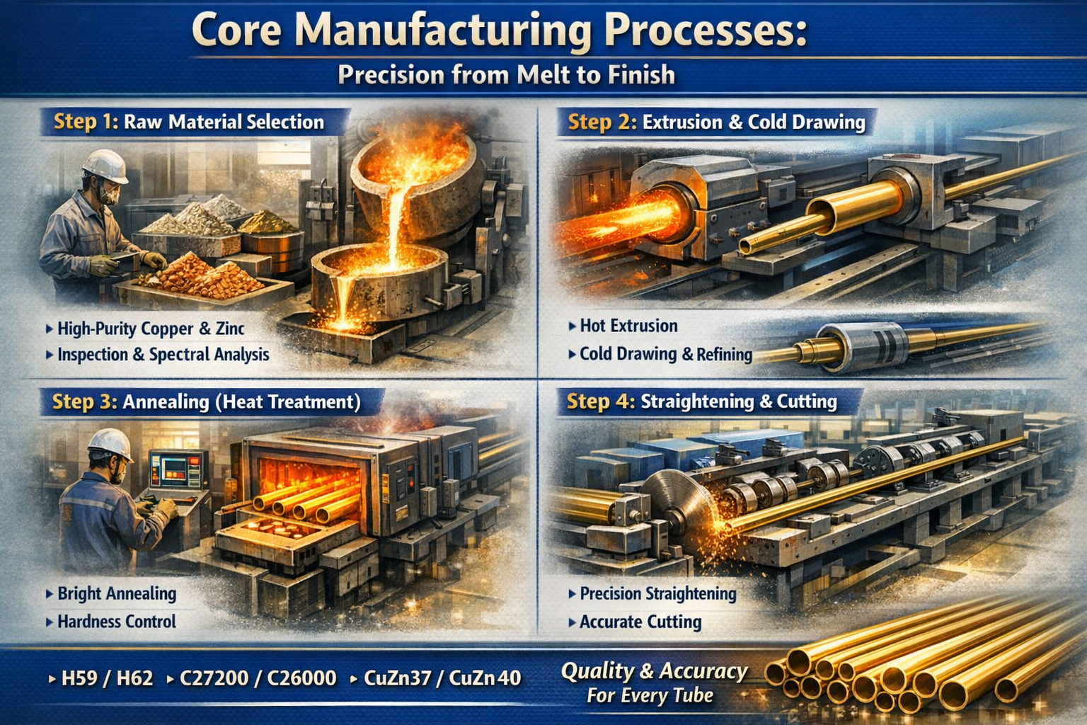 De kwaliteit van een koperen buis wordt bepaald op het moment dat de oven wordt opgeladen. We geven prioriteit aan koper en zink met een hoge zuiverheidsgraad om onzuiverheden te voorkomen die scheuren of voortijdige corrosie veroorzaken.