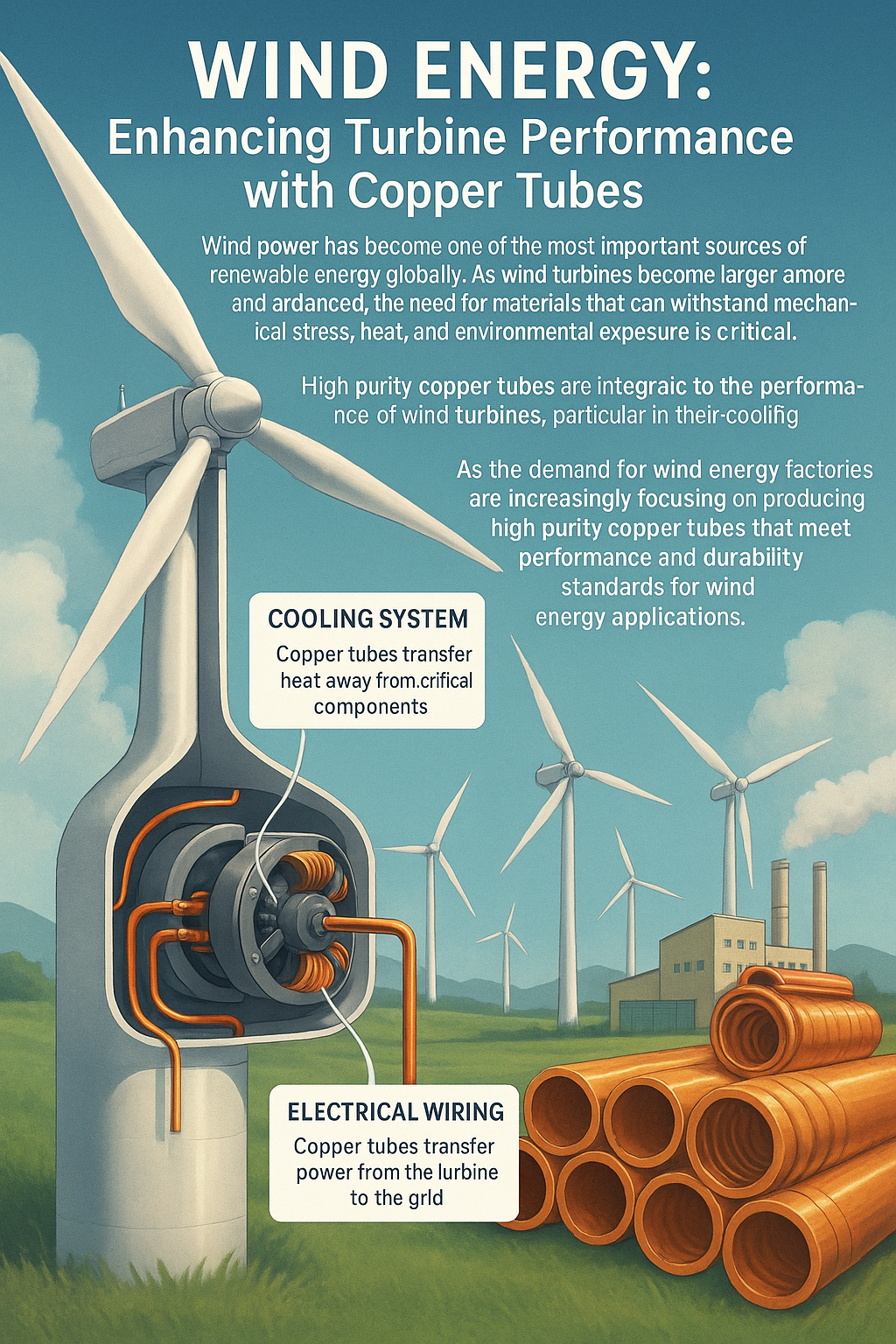 Windenergie is wereldwijd een van de belangrijkste bronnen van hernieuwbare energie geworden. Naarmate windturbines groter en geavanceerder worden, is de behoefte aan materialen die bestand zijn tegen mechanische belasting, hitte en blootstelling aan het milieu van cruciaal belang. Zeer zuivere koperen buizen zijn essentieel voor de prestaties van windturbines , vooral in hun koelsystemen en elektrische componenten.